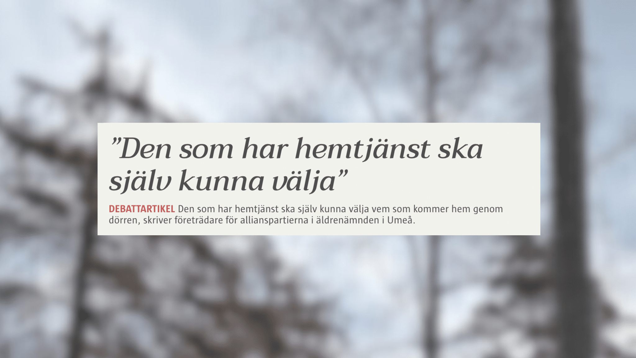 För oss i Alliansen är utgångspunkten enkel: Den som har hemtjänst ska själv kunna välja vem som kommer hem genom dörren, skriver företrädare för allianspartierna i äldrenämnden i Umeå.